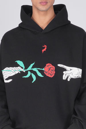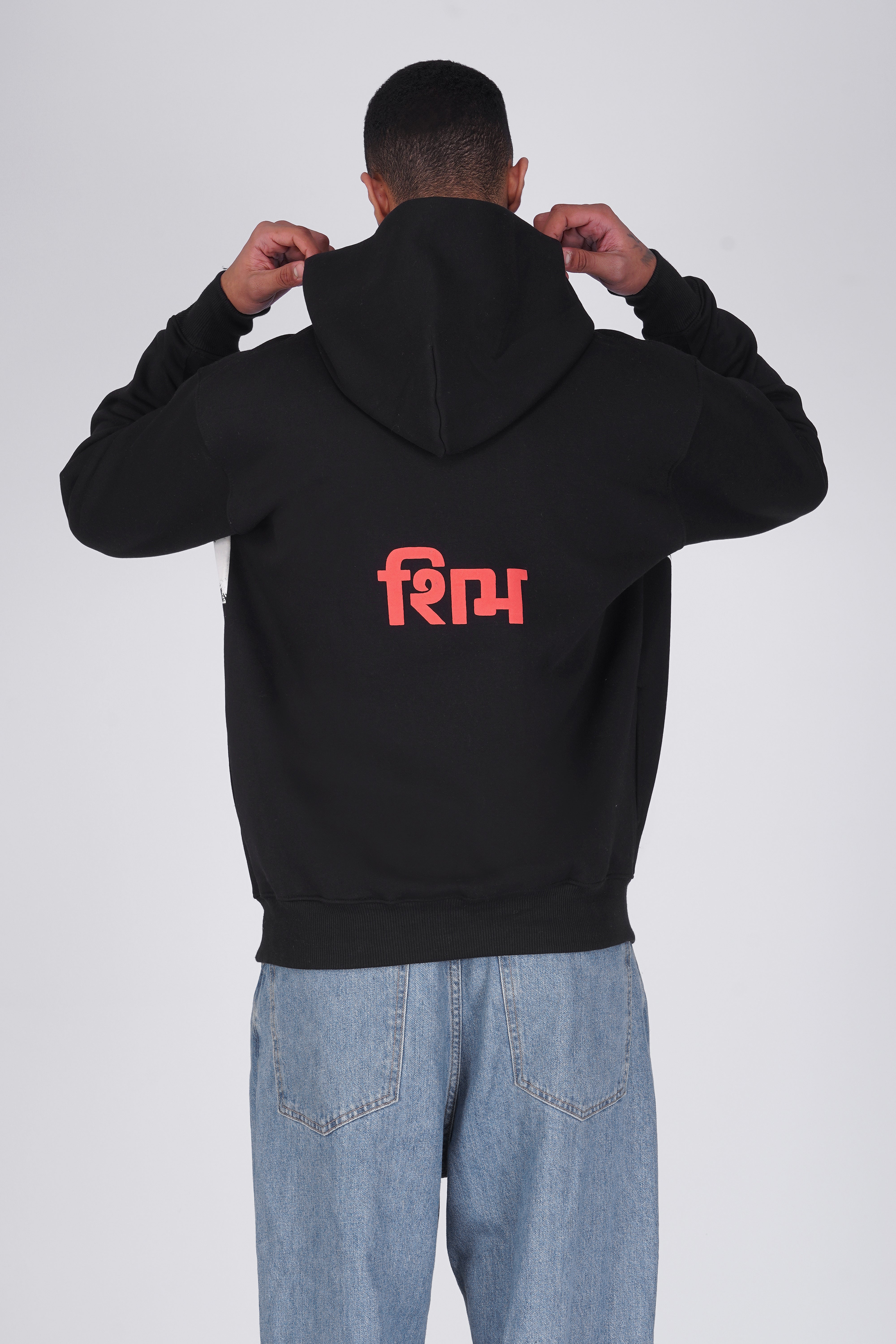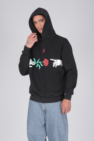The front of the hoodie is puff printed with two hands exchanging a rose, which represents pain and sorrow. Below the neck, the ibex logo is puff printed in red. At the back, the Hindi logo is screen printed in red.